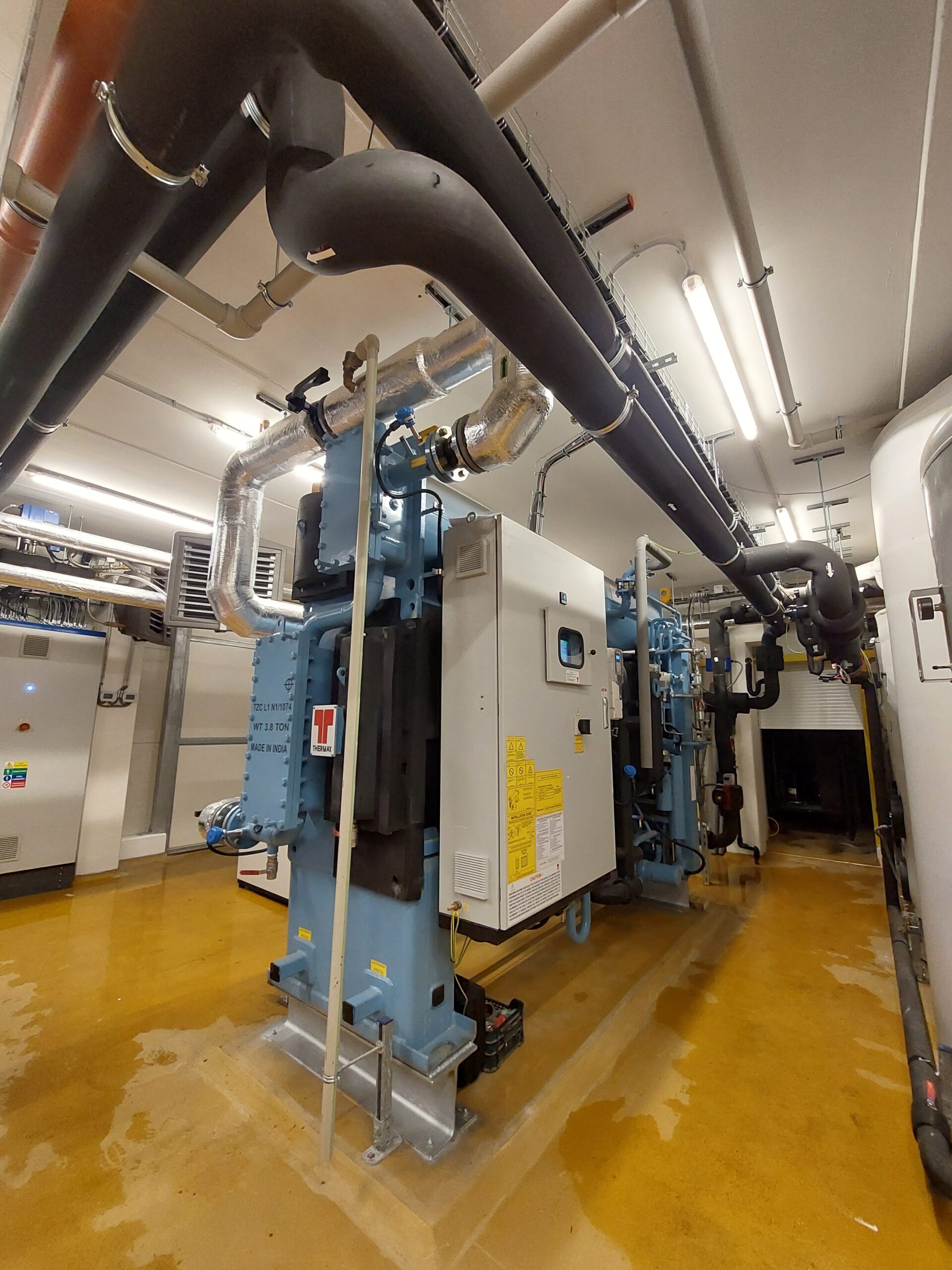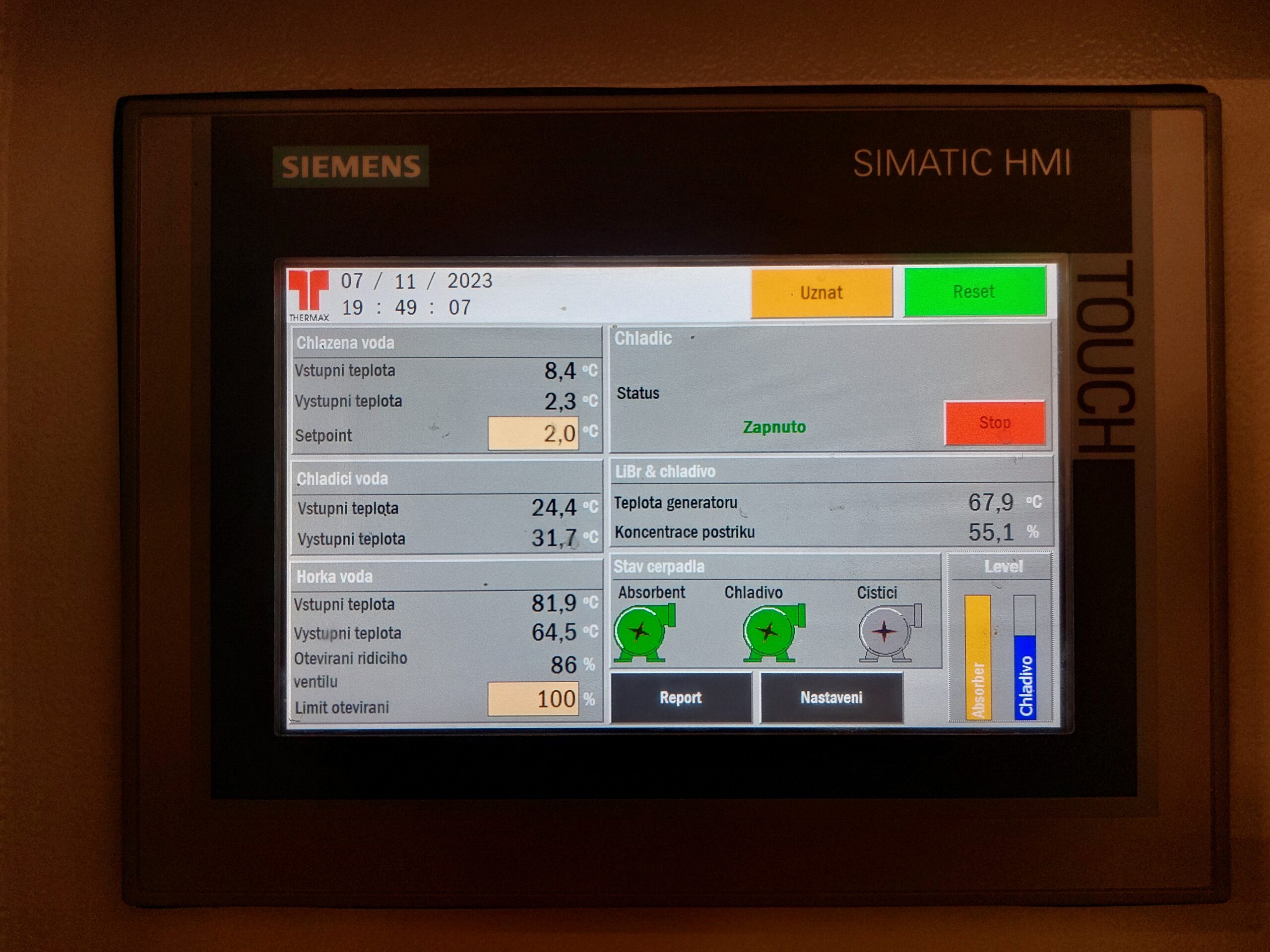Dodali jsme a nainstalovali absorpční chilleru THERMAX pro výrovu ledové vody o teplotě 2°C vč. 15m3 akumulační nádrže na ledovou vodu. Provedli jsme instalaci také TČ voda-voda o výkonu 119 kW k rekuperaci tepla z chlazení mléka.